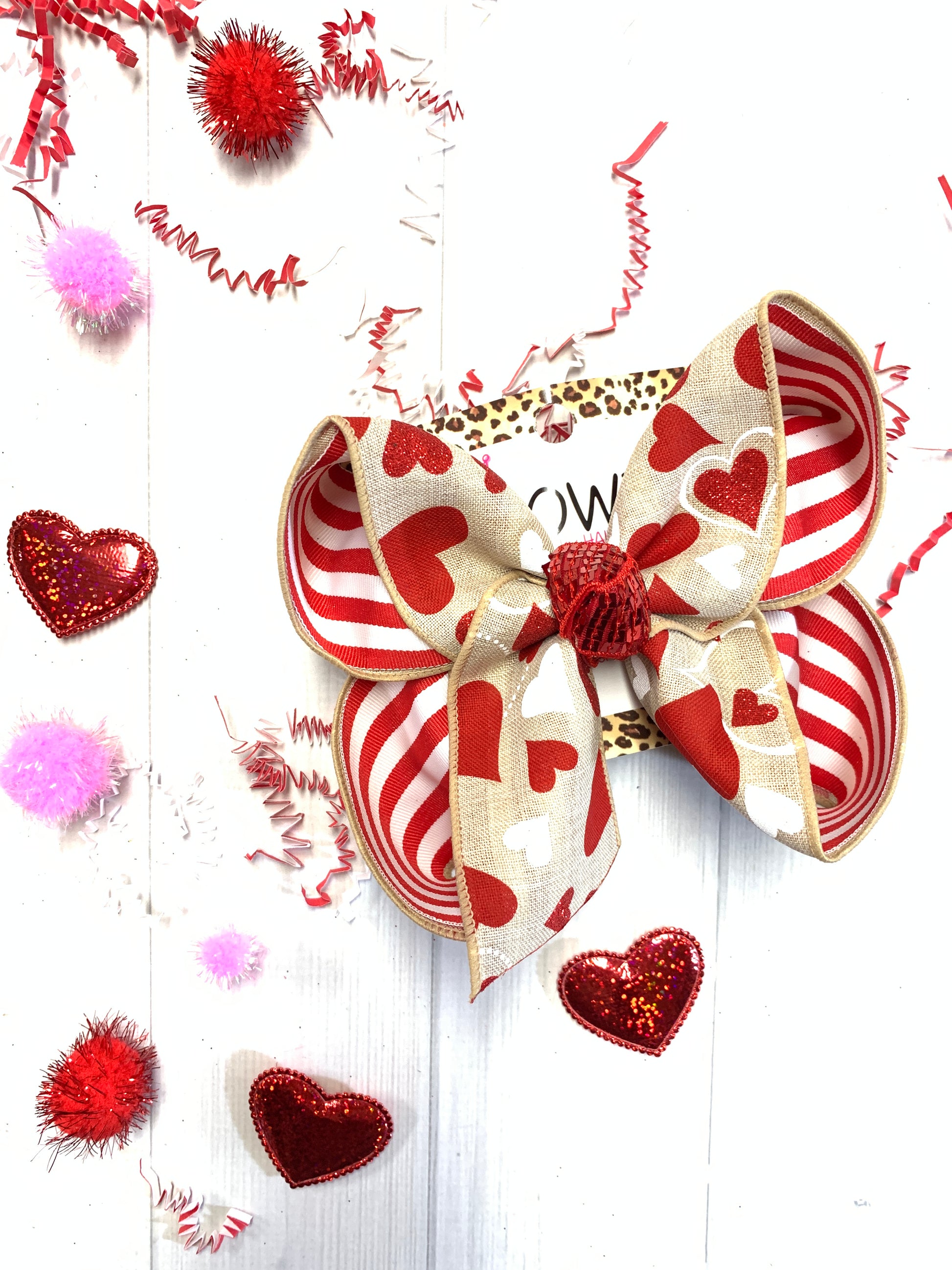 Valentines Day Fun Bow ~ Faux Burlap Hearts Layered on Red & White Stripe ~Hairbow by iBOWZ