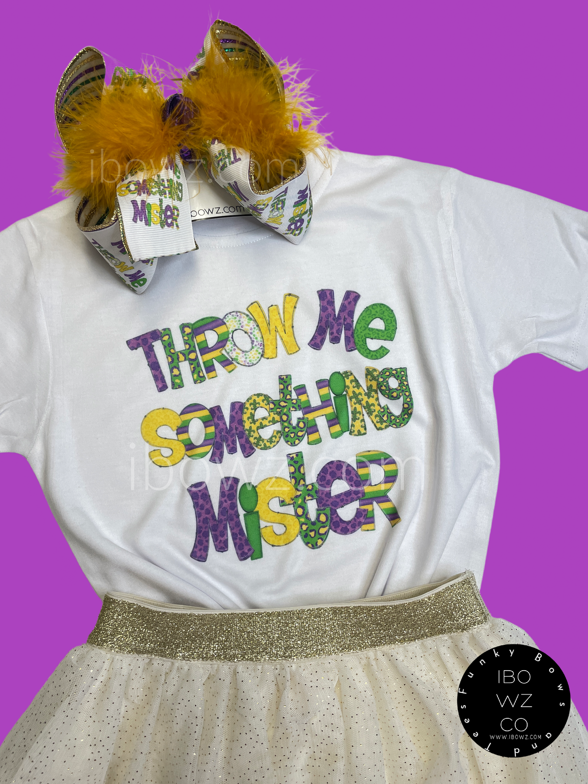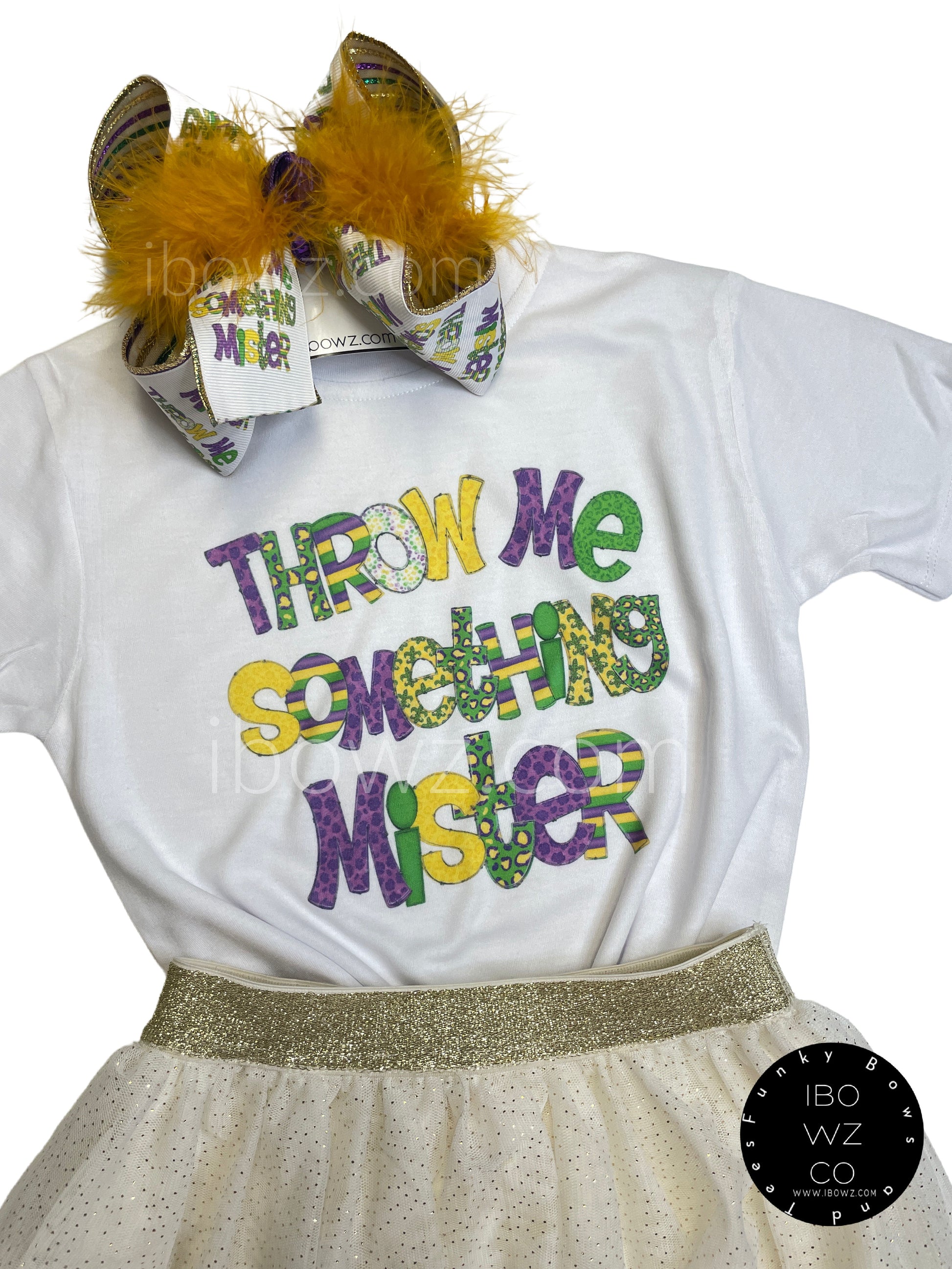 Mardi Gras Throw Me something Super Cute design hairbow & Tee Combo