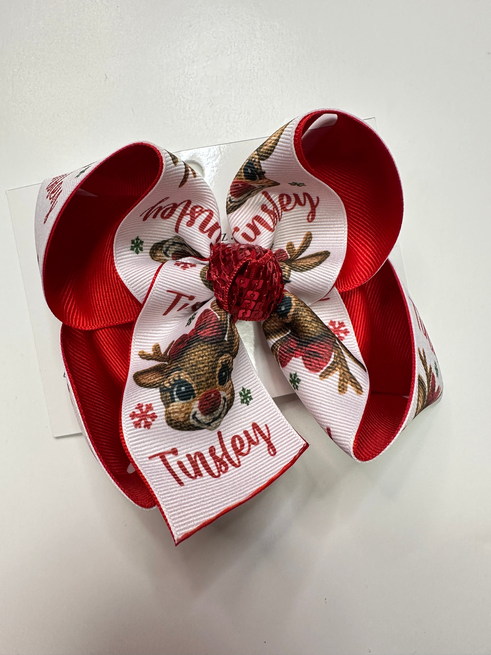The Bow is the same Personalized Crochet Girly Reindeer Christmas Design on a white ribbon layered on Red ribbon