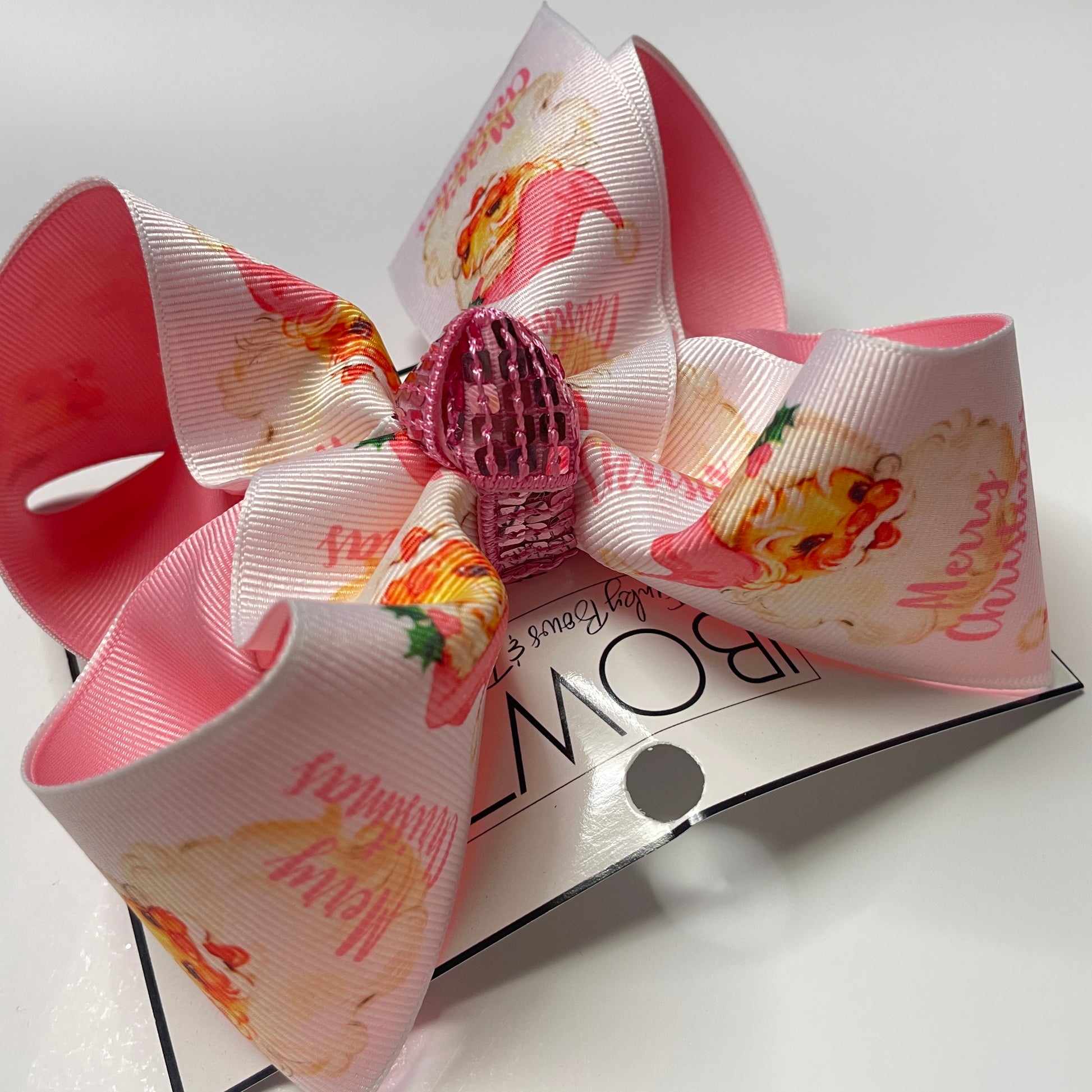 - The Bow is the same Vintage Pink Santa Design on a white ribbon layered on Pink to match the sleeves
