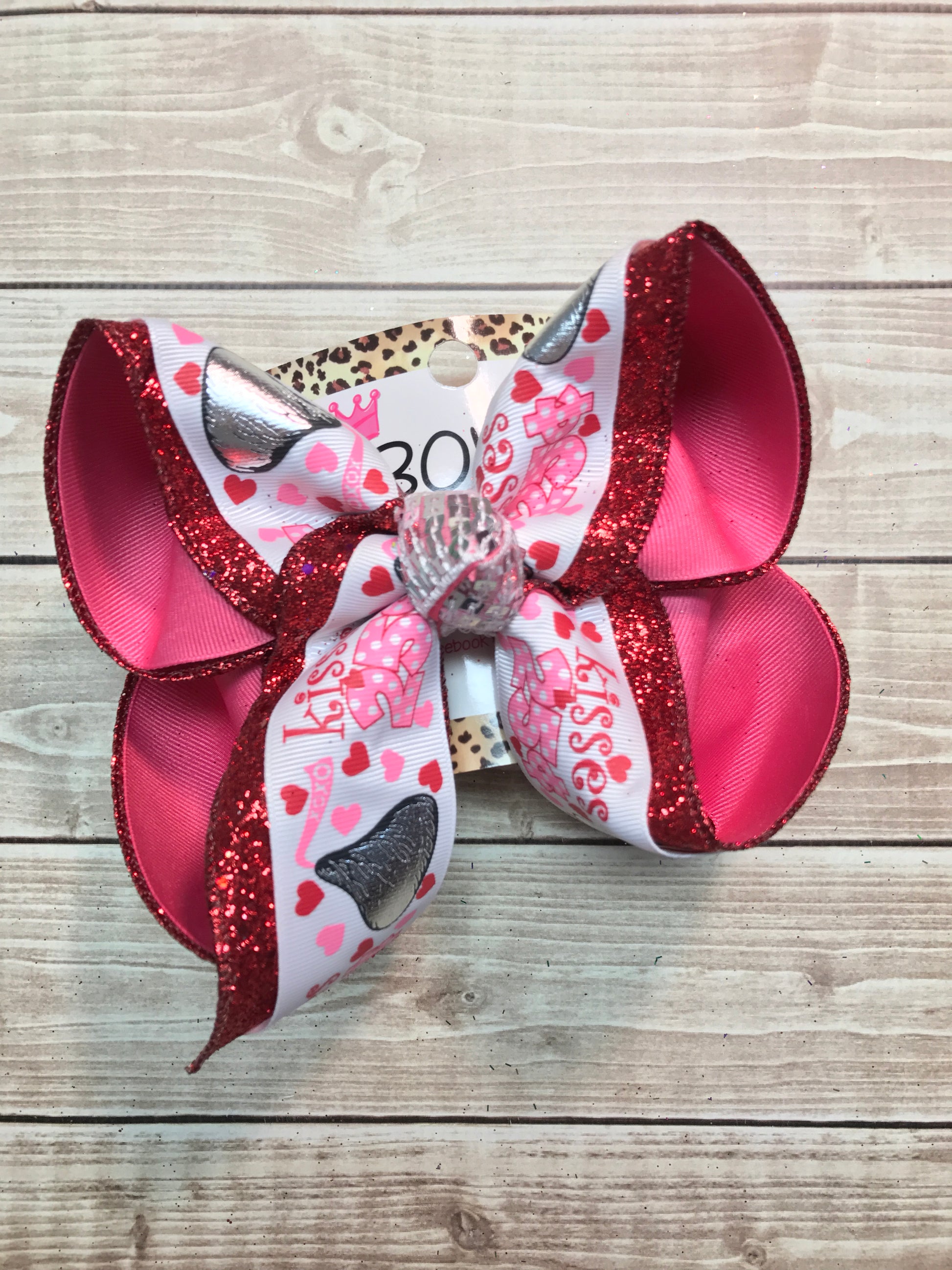 - Valentines Hersey Kiss Fun Bow Layered on Red Glitter on Hot pink